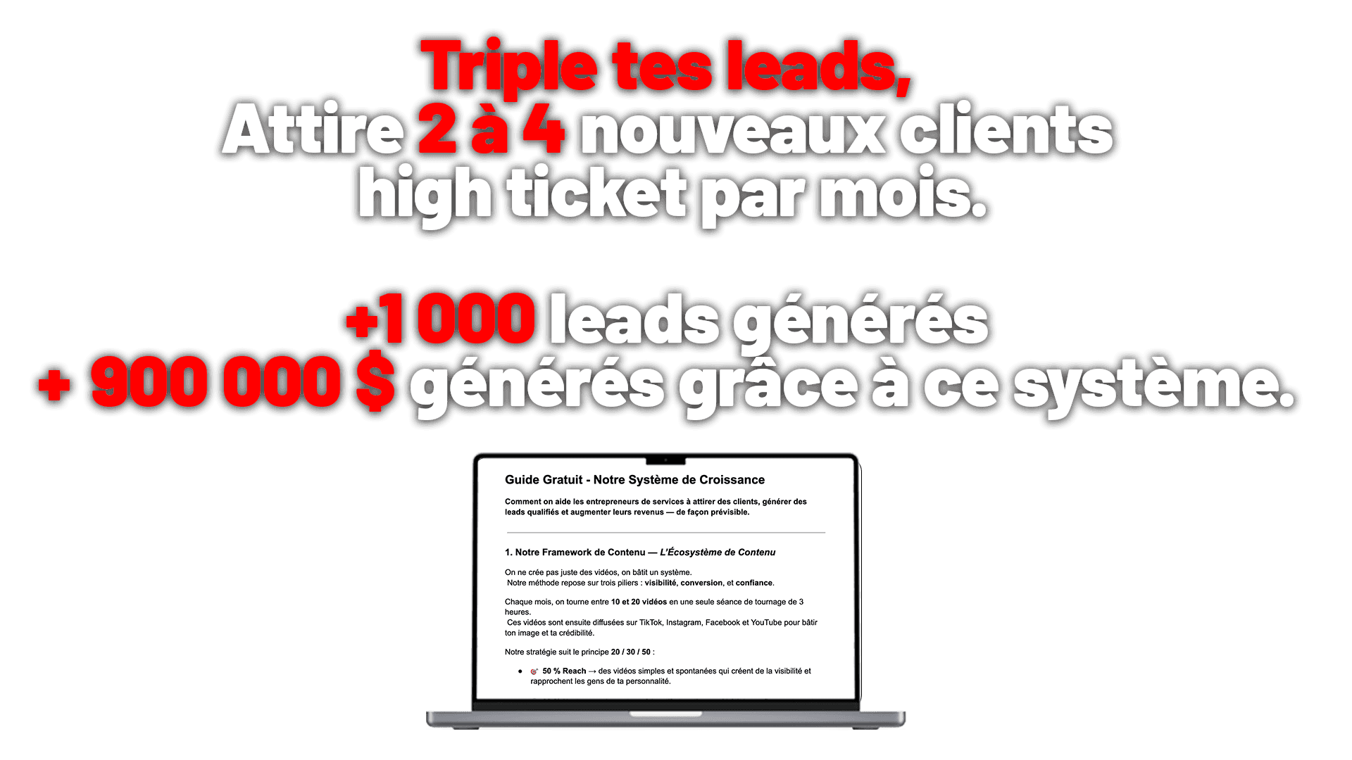 C’est un framework clair et applicable, basé sur des systèmes réels qui combinent contenu, publicités, outreach et automatisations, afin d’aider les entrepreneurs de services à générer des leads qualifiés et croître de façon plus prévisible.
